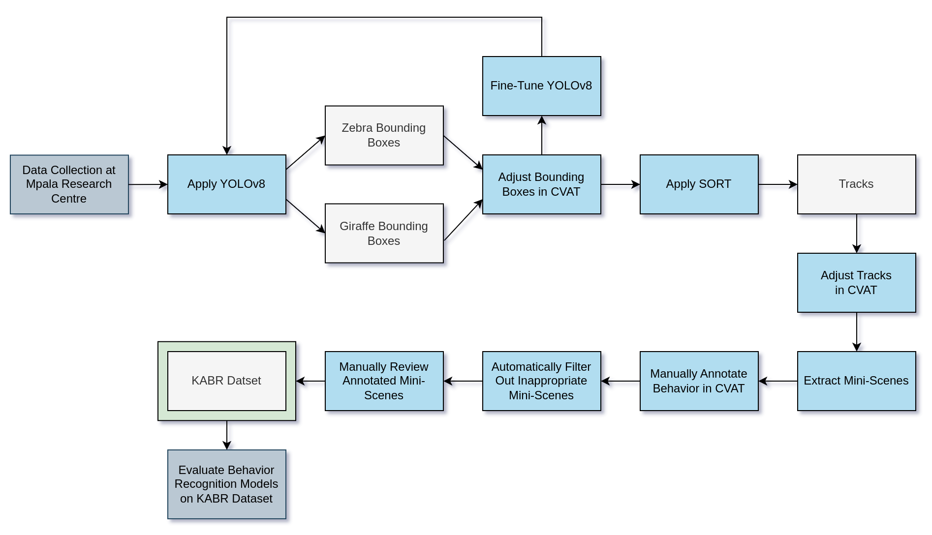 We developed kabr-tools to create a layer between animal detection and manual correction of detected coordinates. These tools enable the identification of any inaccuracies in the automated process and provide a way to correct them in a timely and efficient manner. We also developed an interpolation tool that fills in any missed detections within a track, thereby increasing the overall tracking quality. This tool uses an algorithm that estimates the animal’s location based on its previous movements, helping to fill in gaps where the automated detection may have failed. The complete data processing pipeline for the KABR dataset annotation is shown below: